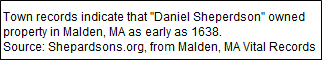 The second Daniel followed the trade of his father, making his home at Maiden, Mass., for some years. His name appears as one of a number who signed a petition to Sir William Phipps, 17 October 1694, praying to be permitted to establish a settlement at Attleboro, Mass. He seems to have owned land there as early as 1660. He took a prominent part in the town affairs. With this removal from Malden the Shepardson family found its home in a tract of land called "Rehoboth North Purchase", which included what later became the towns of Cumberland, Rhode Island, and Attleboro, Norton, and Mansfield, Mass., places in which the family has been represented almost continuously for more than two hundred years.